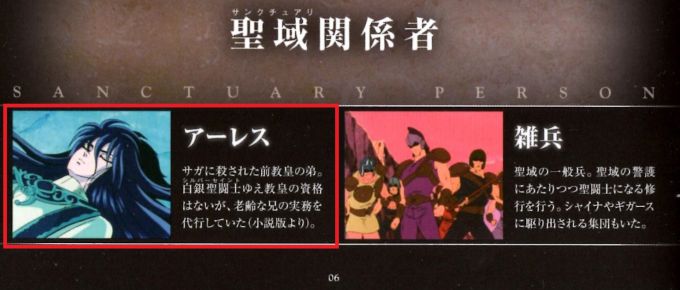■ Le livret des DVD "Andromeda Box III" sorti en juin 2003 classe Āres dans la catégorie des personnes du Sanctuaire (聖域の人たち).