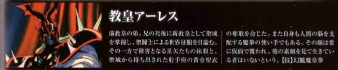 1. Le Pope Shion, d'un âge avancé, possède un petit frère. Il se nomme Āres et possède un casque rouge.