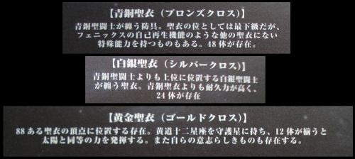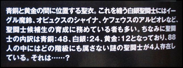 ■ Sans surprise, le catalogue Saint Seiya Chronicle distribué par Bandai/Toei Animation lors de l'avant-première de Saint Seiya ~ Soul of Gold (mars 2015, Japon) annonce 48 Bronze Cloths, 24 Silver Cloths, 12 Gold Cloths pour une armée de 88 Saints. Un descriptif de chacun des chapitres de la série TV et des OVA est également présent.
