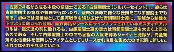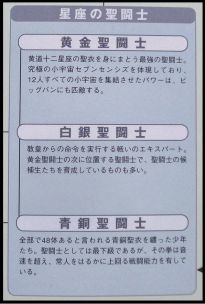 La répartition des différents ennemis ainsi que l'organisation précise du Sanctuaire sont présentées où parmi les Saints avec constellation, 12 Gold Cloths figurent en haut de hiérarchie. Aucune mention du nombre de Silver Cloths n'apparait dans le document alors que pour les Bronze Cloths, il est dit qu'elles sont au nombre de 48.
