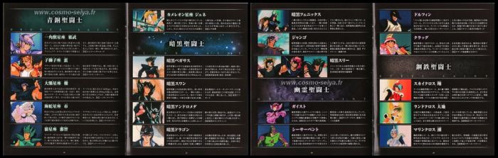 ■ Le Saint Cloth Chronicle (août 2008) offre la particularité de proposer un contenu tant bien lié aux produits dérivés qu'à l'anime : descriptions des figurines actuelles et du passé ainsi que de leurs compléments, présentation de l'anime (personnages, série TV, OVA et sorties DVD), interviews. La section consacrée aux Saint Cloth Myth invite le lecteur à découvrir la série de figurines à travers un classement réalisé par type de Cloths, armée ou encore par catégorie de personnages. Les Gold et Bronze Cloths mais aussi les Silver Cloths sont introduites par des informations spécifiques à l'anime.