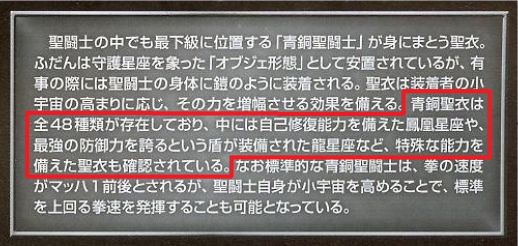 - La section des Bronze Saints n'affecte aucun nombre quant aux Bronze Cloths. Néanmoins, la section Cosmo Chronicle (小宇宙クロニクル) présente à la fin du livre détaille et clarifie les mots-clés de l’œuvre, avec par exemple, les "Bronze Cloths". Le description proposée par le glossaire utilise une tournure qui laisse place au doute en écrivant qu'il y aurait 48 Bronze Cloths.